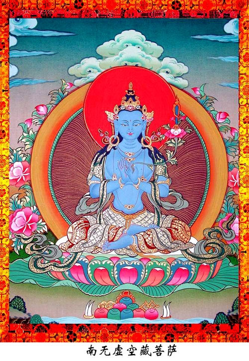 虛空藏菩薩名號的梵音是AKASAGARBHA,他的密號:庫藏金剛。虛空藏菩薩為三世諸佛第一輔臣,功德浩蕩遍滿虛空,智慧無邊恒沙難喻,忍辱心如金剛,精進猛如疾風,具足一切三昧。為一切眾生無上福田,一切人天所應供養。