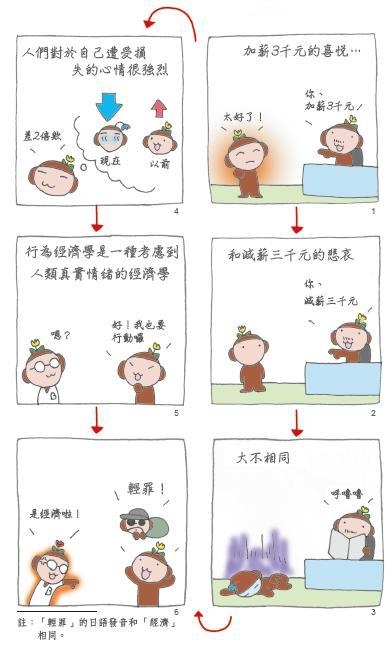 就傳統的經濟學來看,減薪與加薪兩種情況一樣都是3千元,應當會平等看待加薪的喜悅和減薪的悲哀。不過,實際上兩者的情緒反應卻有所差距。而行為經濟學便不同於這種理論型的經濟學,它以情感判斷為前提,透過實驗與實際社會經驗,解析人類各式各樣的心理反應和行動傾向。