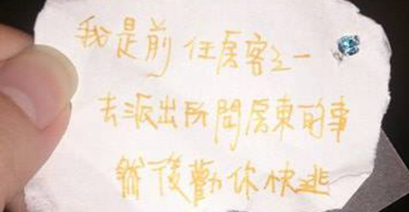 她朋友到世新附近租雅房,沒想到在牆上文宣裡找到一張前任房客留下的紙條,裏頭寫著:「我是前任房客之一,去派出所問房東的事,然後勸你快逃!」