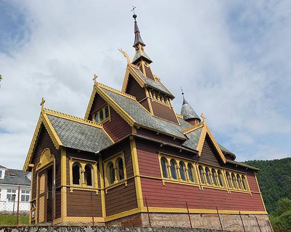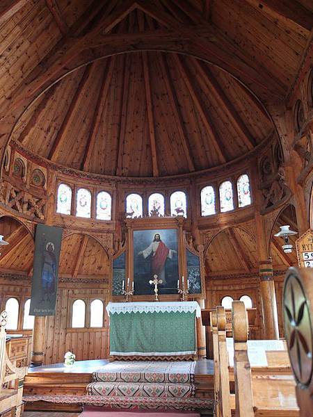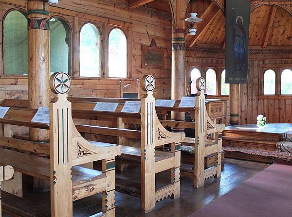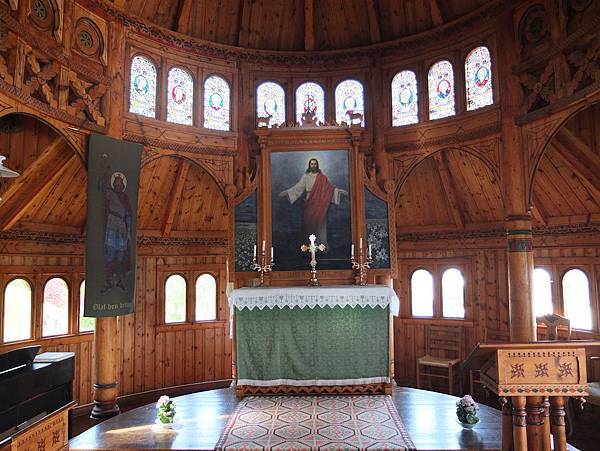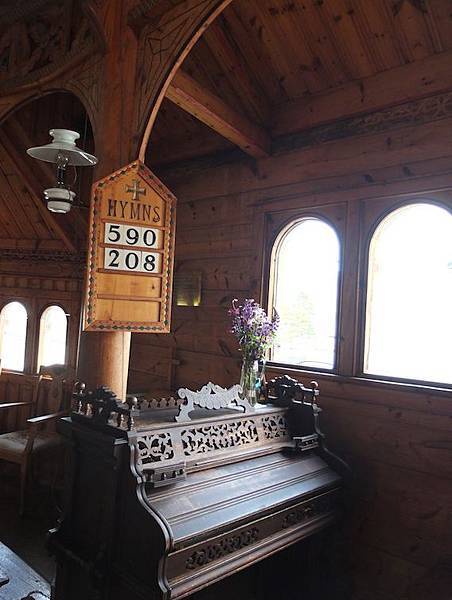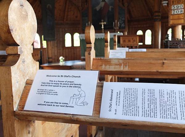 教堂非常的小,但建築本身卻很有特色。事後才知道像St Olaf’s這樣的木板教堂是挪威的特色建築,此行只在Flam跟Balestrand有印象看到類似的建築,外觀和教堂內都獨樹一格。
