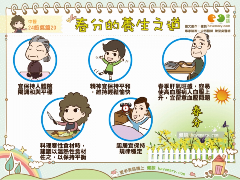 1. 春分平分了晝夜與寒暑,因此,也要注意保持人體陰陽調和與平穩。