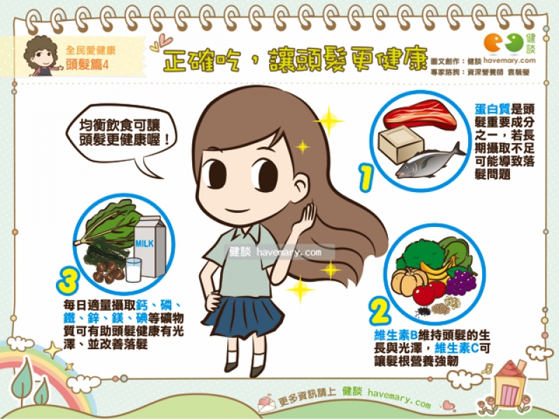 照顧一頭秀髮需要補充哪些關鍵營養成分?資深營養師袁毓瑩表示,想要維持頭髮健康,首重均衡飲食,並可從天然食材中多補充蛋白質、維生素B、C與礦物質,都有助維持頭髮健康。