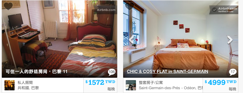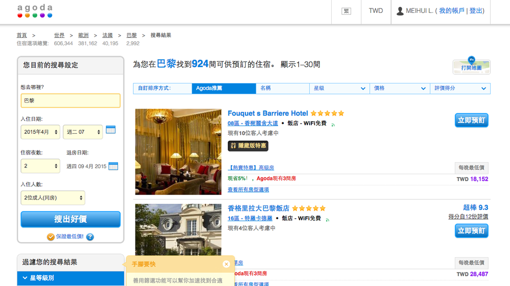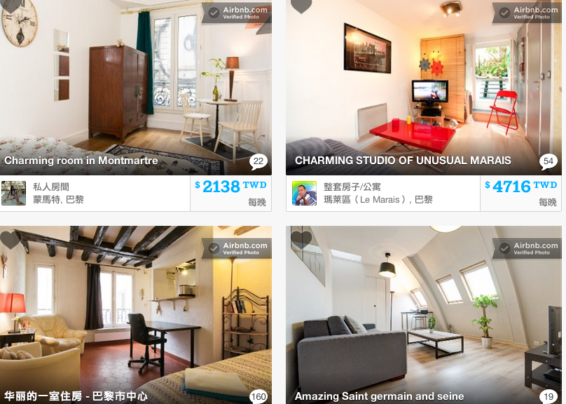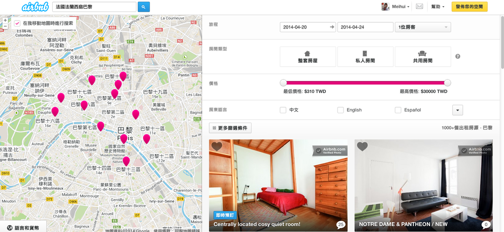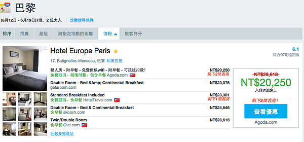 我設定了巴黎之後,就會跑出一堆堆飯店,就可以慢慢找到你想居住的地方囉!