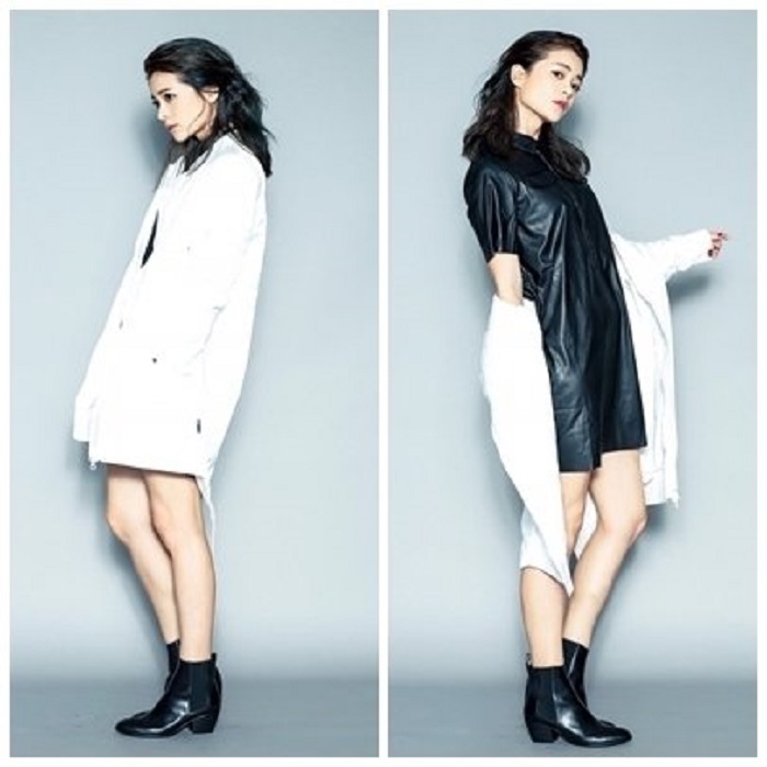從去年流行的韓系風格就可看到長版的趨勢,這次用少見的白色長版飛行外套+黑色皮革洋裝,以黑白為主軸,混搭女人味和帥氣的風格,更加有味道。