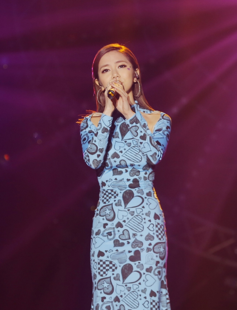有別於前兩頒獎禮大秀舞技,今次《酷音樂亞洲盛典》的舞台上選唱燴炙人口的《多遠都要在一起》及《喜歡你》掀起全場大合唱彷彿置身於演唱會中,細膩度令人聽出耳油。觸目的話題舞台造型方面,是與專輯《新的心跳》主題吻合的貼身長裙, 特別設計的藍色心心布料玩味甚濃! 其貼身度及大露背心型剪裁盡顯G.E.M. 瘦身後的好身材,青春迫人,再一次成功吸睛!