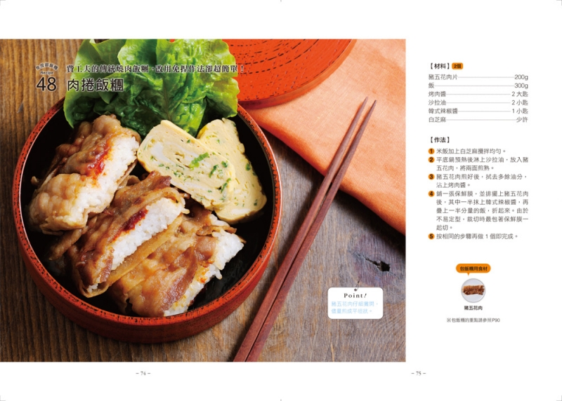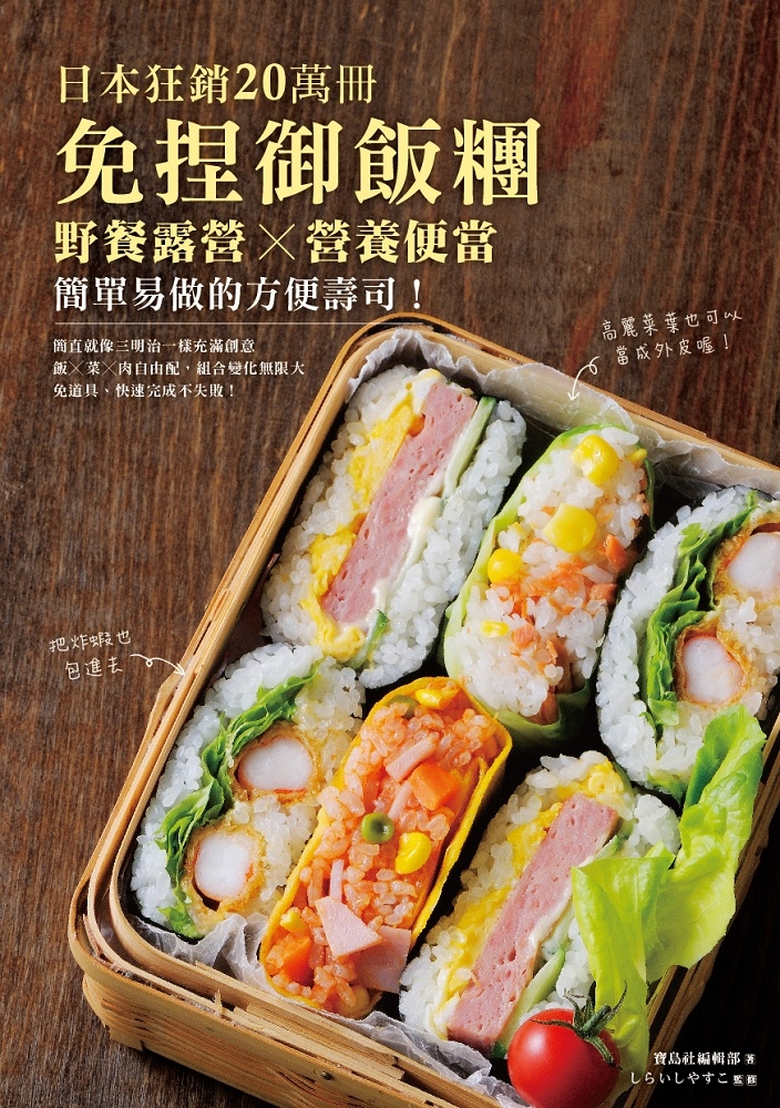 飯糰難道只能用海苔包嗎?其實,「煎蛋皮」、「燒肉片」、「昆布絲」、「紫蘇」、「高麗菜」等食材也能變身外觀亮眼的飯糰外皮!本書就要教你,用這些食材也能輕鬆包飯糰的訣竅。將不同顏色、口味的飯糰,以及玉子燒、培根捲、小番茄起司沙拉等小菜,一起放進便當盒或野餐籃裡後,你的餐點就是與眾不同。