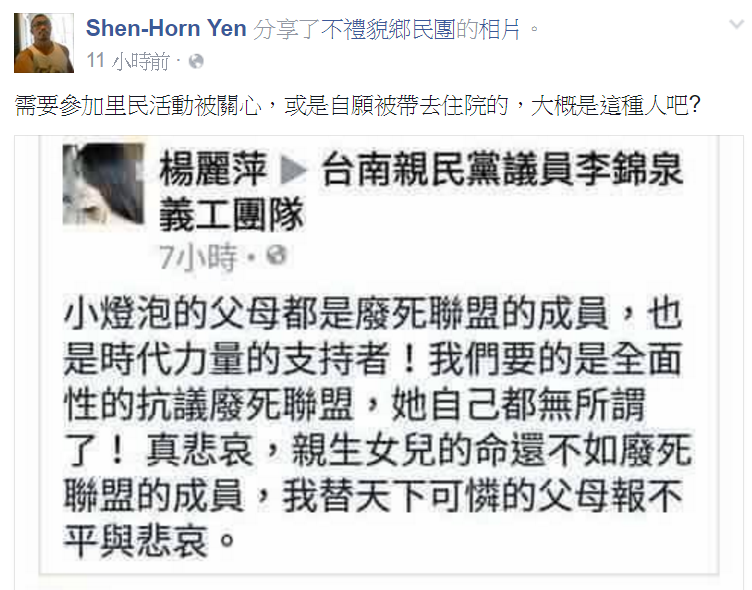 不禮貌鄉民團今日公布了一張臉書截圖,發現已經有人開始對小燈泡媽媽貼標籤,鄉民團直指這種心態,就是『妳沒跟我一起參加討伐他們的行列,妳一定是他們派來的奸細,或者被他們收買的臥底』即便女童媽媽才是受害最深的一個人,卻仍被瘋狂獵巫者追殺。教授顏聖紘在臉書分享這則圖片,更直指柯文哲日前提出要找出來參加里民活動或者住院的怪人,大概就是這種人吧!