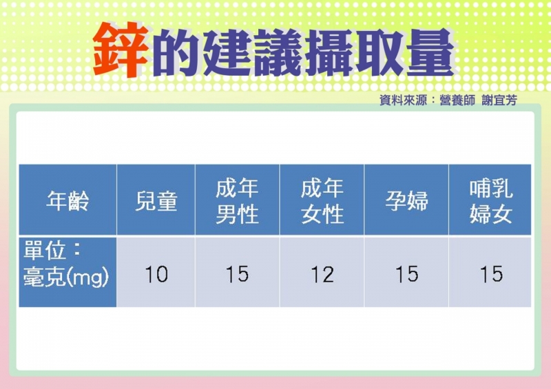 營養師謝宜芳表示,微量元素「鋅」在人體內的含量僅次於鐵。成人體內含鋅總量為1.5-2.5公克,其中90%分布在骨骼與肌肉,其他分佈在肝、腎、胰臟、腦、皮膚、前列腺等器官,存在人體的濃度高於其他14種微量元素,甚至高於巨量元素鎂。但是人體卻沒有儲存鋅的機制,因此透過每日的正確的飲食攝取相當重要。尤其在人體缺鋅時,對於成長機能與發育、能量營養素代謝、免疫機能、食慾、味覺、皮膚健康、傷口癒合等,都會有不等程度的損傷,影響相當廣泛,根據2008年國民營養調查顯示,近8成民眾是缺鋅(和缺鉀、鈣)一族,所以從兒童、成年男性、女性、孕婦及哺乳中的婦女,都必須養成每日一定的攝取量。