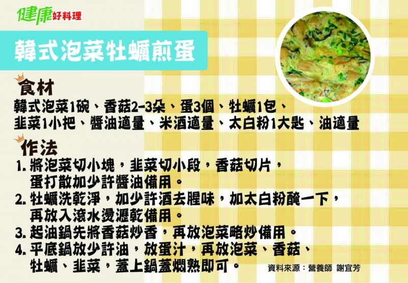 - 平底鍋放少許油,放蛋汁,再放泡菜、香菇及牡蠣、韭菜,蓋上鍋蓋燜熟即可。