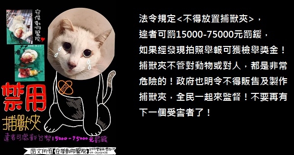 法令規定<不得放置捕獸夾>,違者可罰15000-75000元罰鍰,如果有人發現拍照舉報可獲檢舉獎金!捕獸夾不管對動物或對人都是非常危險的!政府也明令不得販售及製作捕獸夾,全民一起來監督!不要再有下一個受害者了!