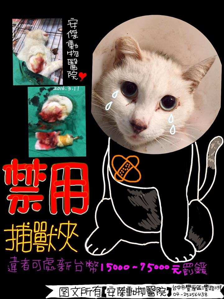 日前有愛媽救援了一隻被捕獸夾夾傷的貓咪,拾獲時捕獸夾已脫離身上,掌骨已完全脫落,貓咪拖著感染的斷肢躲藏了好幾天才被捕獲,因為連續未進食的關係,貓咪體力非常虛弱,也出現黃疸的症狀,來院後緊急截肢手術,目前已能進食少量食物,一開始非常怕人會生氣,照顧幾天後現在已能放心的讓人餵藥了,身體的傷會修復,心裡的傷恐怕需要一點時間!