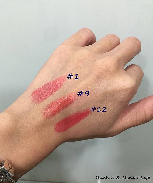 來看看手背試色,#1偏粉 #9偏橘紅(珊瑚色)(和官網照片最不搭) #12偏櫻桃紅