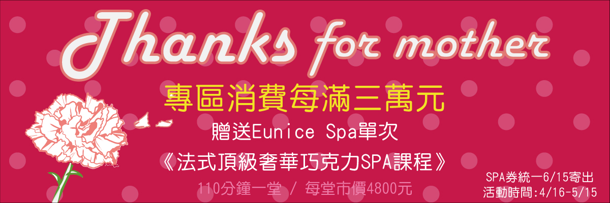 凡於專區購買3萬元,即贈送Eunice Spa單次《法式頂級奢華巧克力SPA課程》乙張,數量有限送完為止。