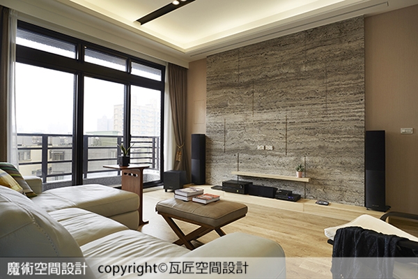 1.礦石天然的美麗紋理,鋪陳於視聽主牆,簡潔有力,隱藏式大型布幕降下,變身家庭電影院。