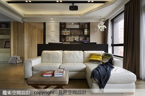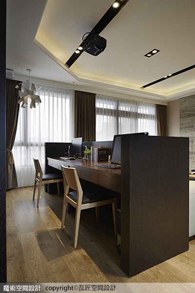 1.瓦匠空間設計陳立騏設計師運用客廳極佳的採光景觀,在沙發後方採用半高隔屏的形式,規劃為雙人工作區,搭配被牆半穿透的造型牆,將展示、收納、美化、隔間等多重用途,畢其功於一役。