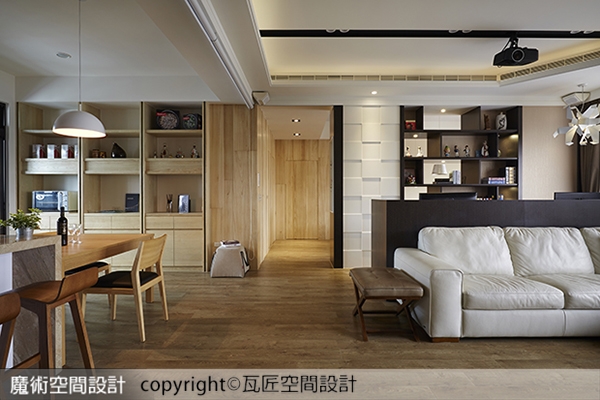 2.陳立騏設計師在沙發後方以半高隔屏規劃工作區,背景牆則以單純木紋、凹凸格狀飾板及半穿透展示櫃,將機能蘊含於美學表現。