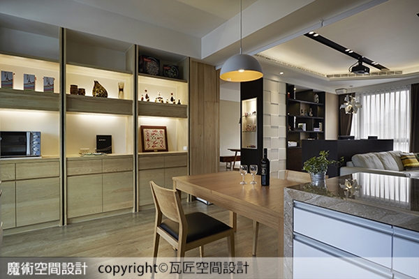 ▲中島與餐桌安排於同一軸線上,空間加倍寬裕,餐具櫃以亮眼的展示牆呈現,兼具小型電器與收納機能。