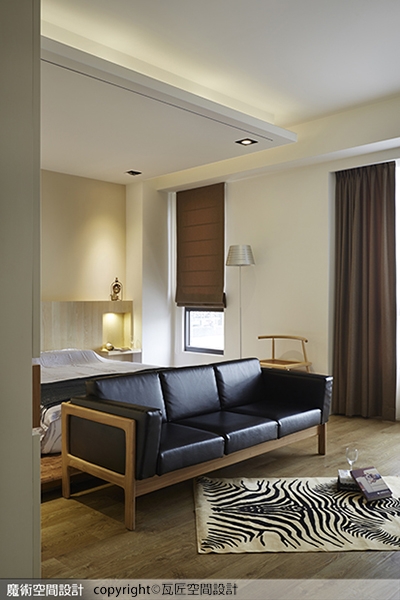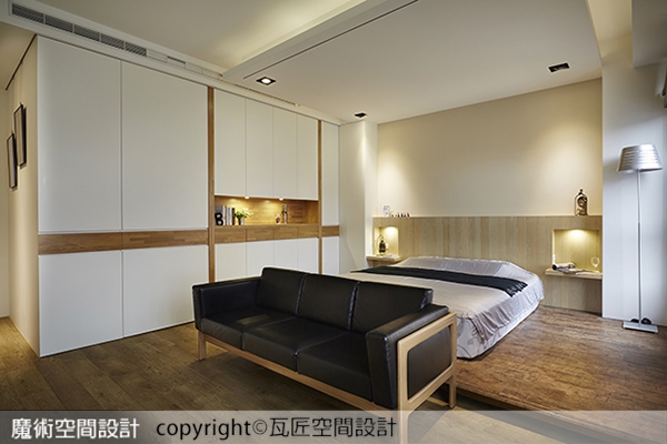 6.陳立騏設計師將主臥劃分為三個區塊,高一階的睡眠區、沙發視聽機能的起居活動區、白色造型牆內的更衣室及衛浴空間。