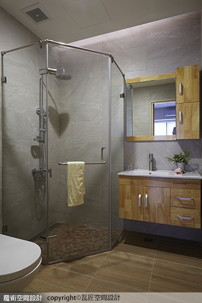 ▲客用浴室採用淺色壁面板岩,發揮小而美的衛浴機能。