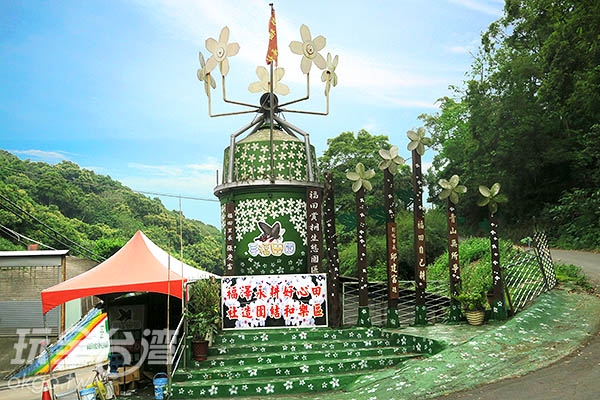 順著蜿蜒的鄉間小路直行,便可到達位於福田里的生態園區,從一旁的裝置藝術便可看出福田里居民齊心打造的幸福園地。