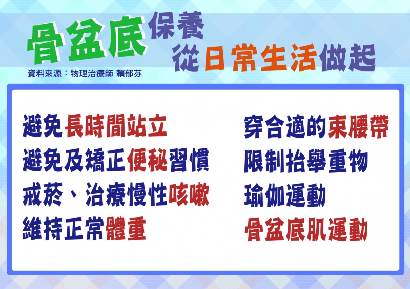 其實,骨盆底肌保養,要從日常生活做起,包括: