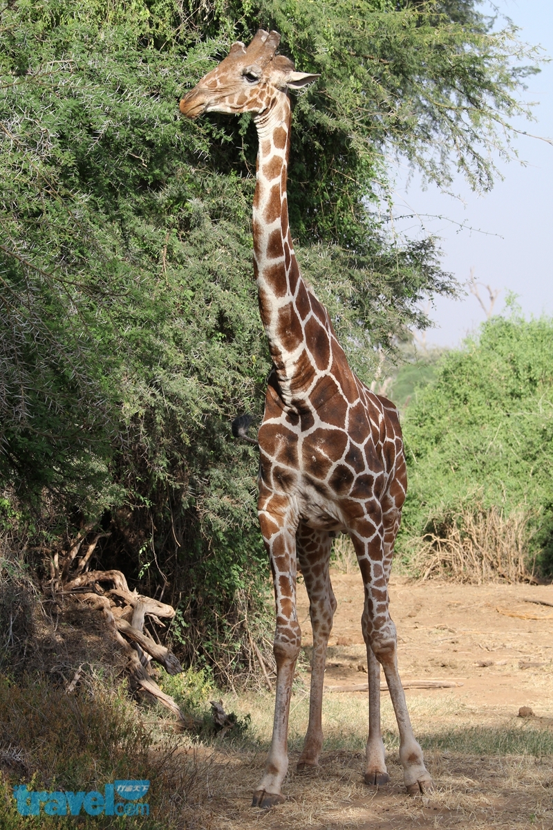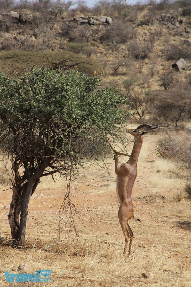 成立於1985年的山布魯動物保護區是路況較佳的一座,因此遊客也比較多,在山布魯的細紋斑馬、長頸羚、網紋長頸鹿這三種動物可是當地獨有的,成了遊客最想看到的經典畫面,很幸運的,我也正好捕捉到拉長著脖子前腳趴在樹上吃嫩葉的長頸羚。