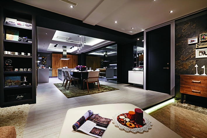 敞朗大器精工質感不同凡響差異材質的創意混搭,也是此案出類拔萃的理由之一,包括從玄關到客廳的地面,鋪設紋理極美的潤澤大理石,淡雅的大地色系,與線條簡潔的層次天花板相呼應,巧妙中和沙發背牆及轉折連續面上粗獷的天然岩片質感,特別是事前將大塊板材先裁切再錯拼的工藝技巧,賦予視覺行雲流水的潑墨之美,更是現代風格家具最理想的背景基底。精算比例的客廳電視牆,採簡潔、沈穩的對稱佈局,兩側展示高櫃搭配低矮的視聽機櫃,予人舒服安定的質感。中央壁面則貼覆精緻的進口花磚,異國風情圖騰所呈現的美感引人遐想,常成為訪客們閒聊的趣味話題呢!