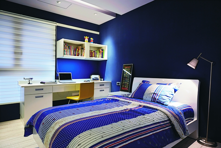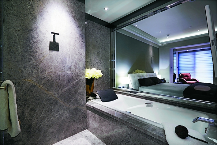 高規格寢臥專屬洗浴享受私密空間同樣令人驚嘆,三間臥室均採套房式配置,並個別施以主題色彩。主臥室以恬靜的灰綠色美化床頭立面,落地窗邊增設小巧休憩區與儲藏室,精準運用每處空間!流露時尚旅店情調的主浴更是一絕,大面清透包框玻璃取代實牆以增加空間穿透感,再佐以捲簾適度屏障隱私,搭配收納機能極佳的客製化檯面浴櫃及乾濕分區設計,更令人倍感禮遇。