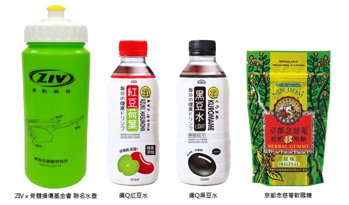 跑者贈品:纖Q紅豆水+纖Q紅豆荷葉水 (限付費報名者)、京東念慈庵軟喉糖8入組(限付費報名者、ZIV x 脊髓損傷基金會 聯名水壺(限前1000名付費報名者)