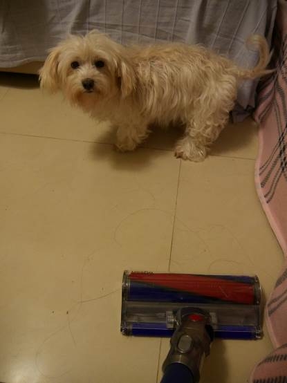 家中其實灰塵的量很大,另外也因為狗寶貝的關係,幫狗狗剪毛的時候,剪下來的毛實在很難處理,用掃把掃地的人一定可以體會到,有時候毛髮一多,就會卡在掃把上,必須用手抓掉掃把上的頭髮…但有了Dyson之後這些問題都迎刃而解啦!