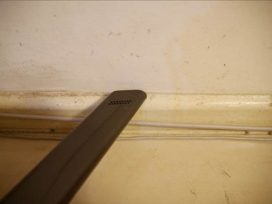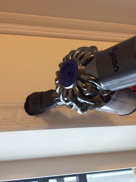 除了椅子、櫃子後面平時不易清潔,天花板的凹槽與縫隙,也是我們常常忽略的地方,這時候另一個吸頭就派上用場啦,前面的毛刷可以掃掉黏著的灰塵,然後瞬間吸乾淨