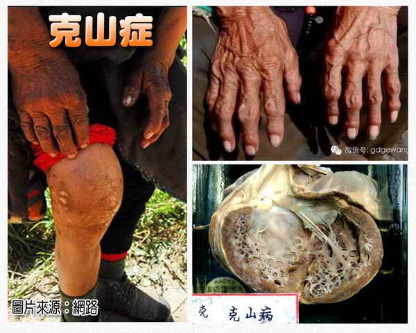 - 心肌病變、關節炎、關節腫痛、行動困難(克山症)