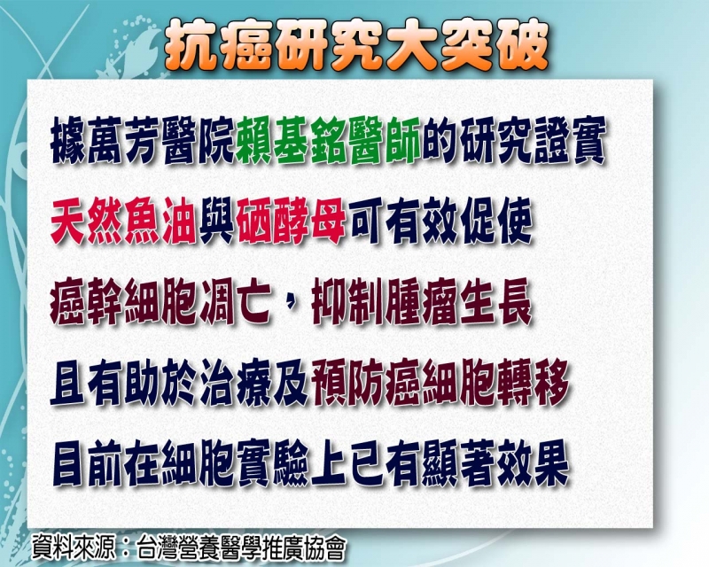 根據萬芳醫院賴基銘醫師對「硒」在抗癌上的關鍵研究指出,他發現天然魚油與硒酵母可促進乳癌幹細胞株的凋亡,而且已在細胞實驗上有顯著效果,有朝一日也可運用在臨床上。更有研究發現,某些罹患癌症的人,血液中的「硒」的濃度較一般人為低;相反的,補充「硒」則可以降低癌症的發生率。