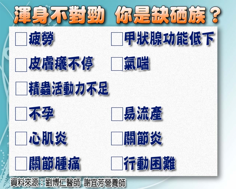 您該如何知道自己是否有缺「硒」?澄清醫院營養醫學門診主任劉博仁與營養師謝宜芳共同提出幾個徵狀,包括: