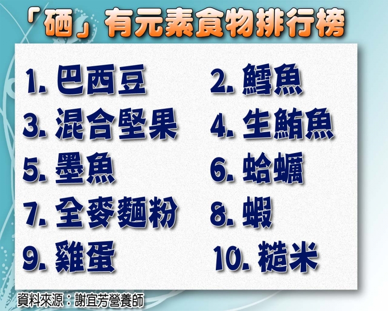 營養師謝宜芳表示,大家該如何補充「硒」,其實可以從天然食物中獲取,其中,有「魔豆」之稱的巴西豆,就有著豐富的含「硒」量,每天只要攝取1顆,就可以滿足每日所需。其他諸如,鱈魚、鮪魚、墨魚、蛤蠣、淡菜與海螺等海鮮,雖然也是「硒」的攝取來源,但劉博仁提醒大家,要從海鮮中攝取「硒」,基本上,生物利用率(亦即體循環或吸收)會比較差,因此,建議大家可多從混合堅果、全麥麵粉、雞蛋、糙米等食物中去攝取,效果相當不錯。