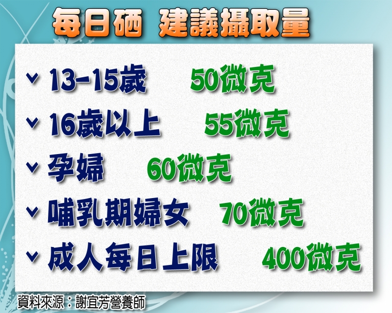 到底「硒」的攝取量要多少才算足夠,營養師謝宜芳表示,根據衛福部所訂的每日營養素的建議攝取量,成人每天所需的「硒」大約50-55微克(一微克等於百萬分之一公克)、16歲以上,約55微克、13-15歲,約50微克;至於孕婦與哺乳婦女則需要60-70微克。一般成人的上限是400微克。