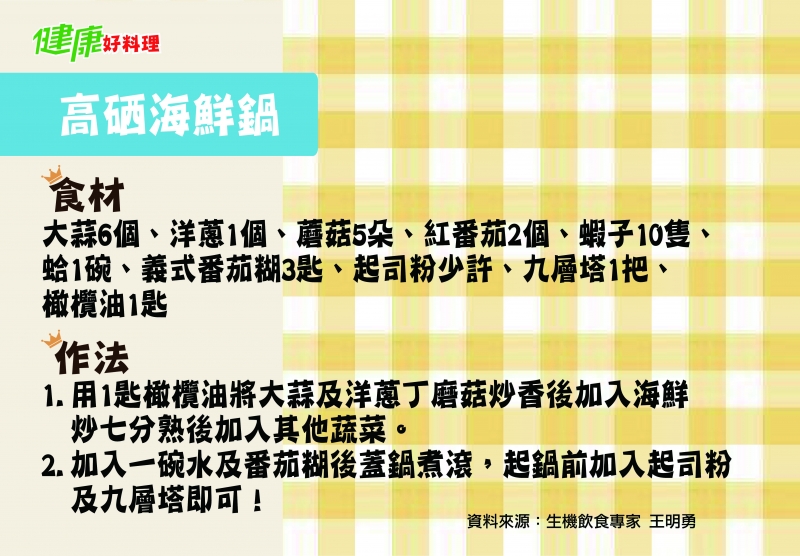 基本上,「硒和鉻」是人體不可或缺的微量元素,生機飲食專家王明勇與營養師謝宜芳則各自獻出私房菜單,教大家如何用吃的來輕鬆攝取微量元素,並維持健康的身體。