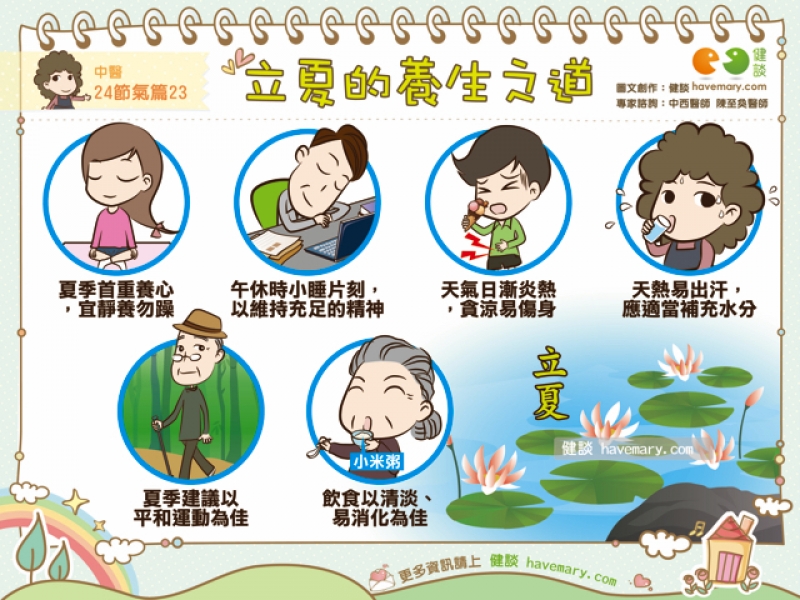 2. 立夏之後,晝長夜短更為明顯,作息相對會較晚睡、早起,因此,中午可適當小睡片刻,以維持充足的精神。