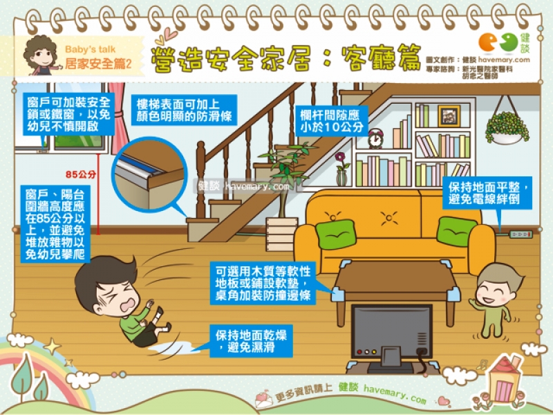 幼兒的活動力強、好奇心旺盛,在家中奔跑、攀爬都是常見之事。新光醫院家醫科胡念之醫師提醒,建議家長可留意居家環境的安全性,包括保持地面平整、乾燥,加設止滑墊、軟墊、扶手、防撞邊條等,都可減少跌墜意外的發生機會。