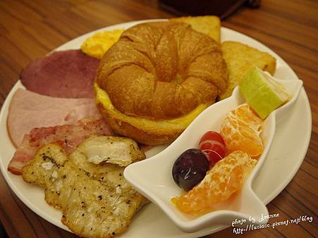 有薯餅、炒蛋、培根、雞排、火腿、牛肉片、可頌還有水果耶