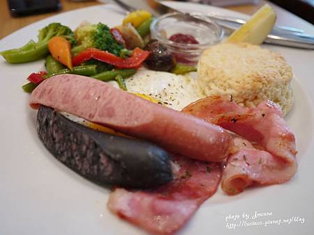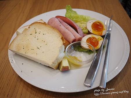 麵包、草莓醬(?!)、蔬菜、德式香腸、墨魚香腸、太陽蛋
