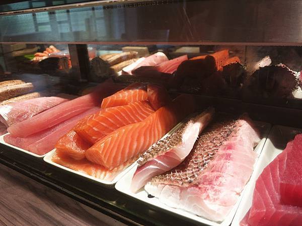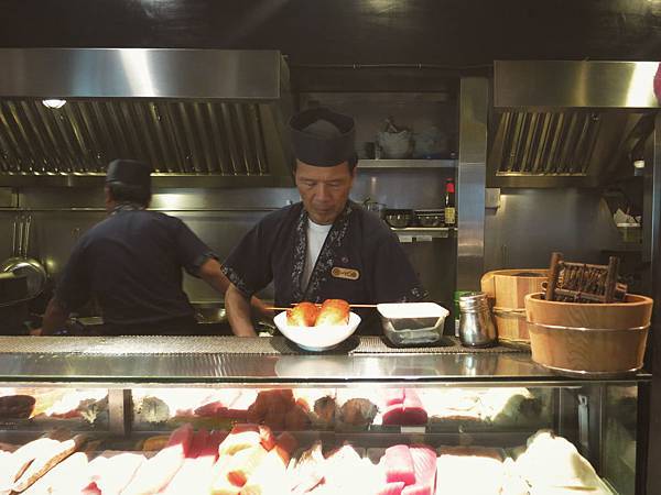看著師傅精準地切出每一片相同厚度的鮭魚生魚片