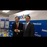 群創董事長段行建(左)交棒給王志超。(鉅亨網記者楊伶雯攝)