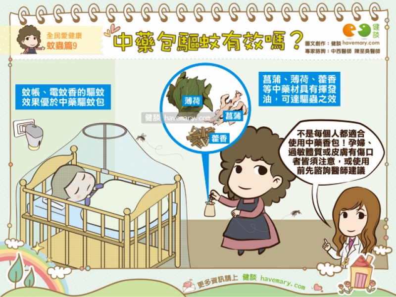 天氣越來越熱,蚊蟲也漸漸多了起來,除了化學的殺蟲劑、蚊香外,網路盛傳的中藥包驅蚊真的是天然又有效嗎?中西醫師陳至奐醫師表示,菖蒲、薄荷、藿香等芳香藥物含有揮發油,蚊蟲大多不喜歡這些氣味,但驅蚊的效果可能不如化學精油;此外,孕婦及過敏體質者亦不適合使用中藥包驅蚊,以免辛香藥造成身體不適。