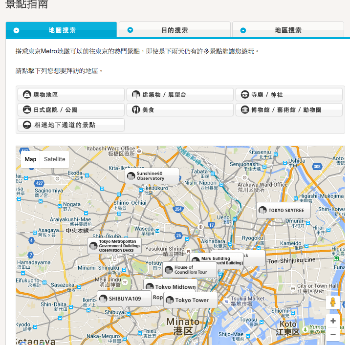 東京Metro的網站上,也有幫大家標注出來各大景點的相對地鐵線路位置,這是做東京景點旅行功課非常好用的資料之一。