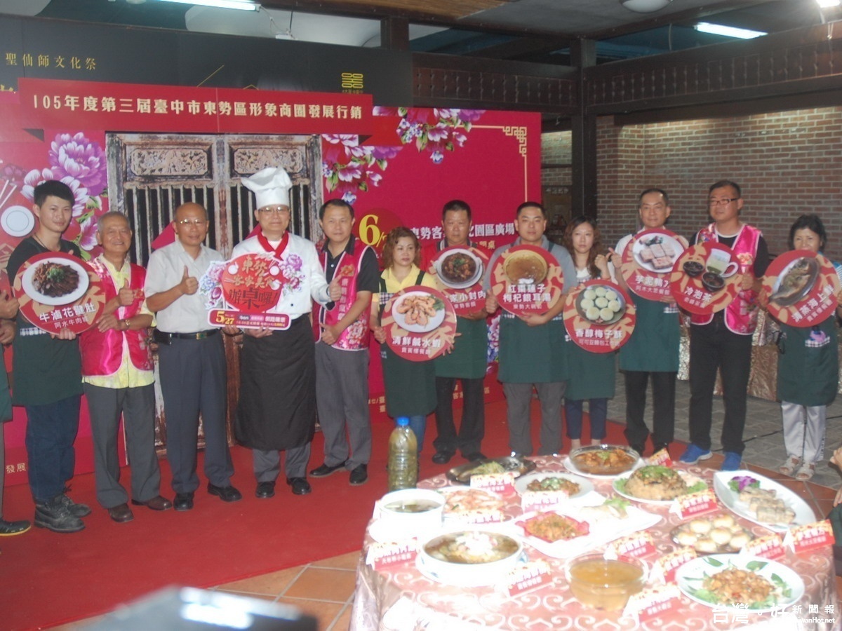 東勢區形象商圈發展協會二十六日宣傳活動中,由十家餐飲業者依序端出各自拿手好料,分別是:牛稼莊-紅燒牛筋、貴賓樓-龍鳳雙拼、錦繡海鮮羹、清鮮鹹水蝦、清蒸海上鮮、阿木大眾餐館-芋泥鴨方、東勢客饌-客家小封肉、大杉林小吃店-福菜肉片湯、阿水牛肉城-牛滷花腱肚、東勢田媽媽-客家米糕、可可豆麵包工作坊-香醇梅子酥、東勢大碗公-紅棗蓮子枸杞銀耳湯,以及奇峰茶葉-冷泡茶等餐飲業者的拿手好料。活動詳情請上二0一六臺中樂購活動粉絲頁查詢。