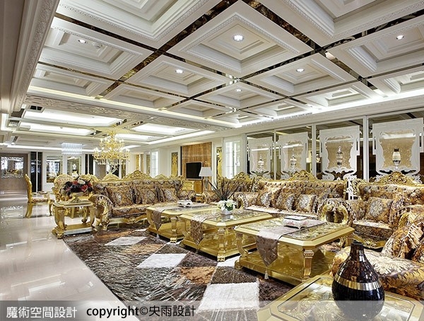 2.【圖說】央雨設計於極度寬敞的客廳天花採用16格立體造型,率先框住視覺焦點,再透過交錯的鏡面飾條,與空間裡的金色家具相輝映。