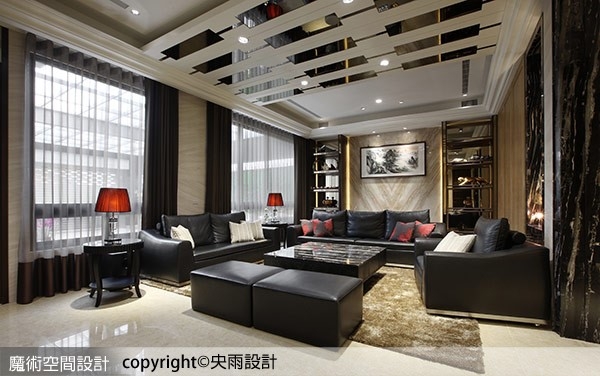 3.【圖說】深色沙發與大理石牆面展現出沉穩大器的客廳格調,央雨設計運用鏡面造型天花,反映出沉穩中的亮點。