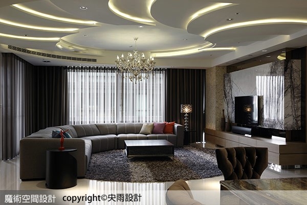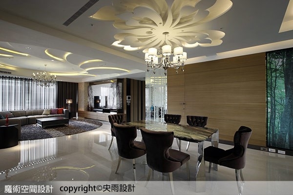 1.【圖說】高難度的客廳天花設計,是在現場精準測量完成初階作業,回工廠進行細部施作,再運返現場重新組合修飾,最後搭配大型水晶燈,難度不亞於任何設計工程,美麗吸睛度也破表。