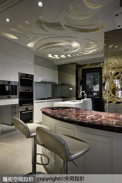 6.【圖說】王千乾設計師順應流線造型的吧檯,在上方以雷射切割天花板表現豐饒的花葉意象,呼應周邊紋飾,帶出別開生面的餐廚天空。